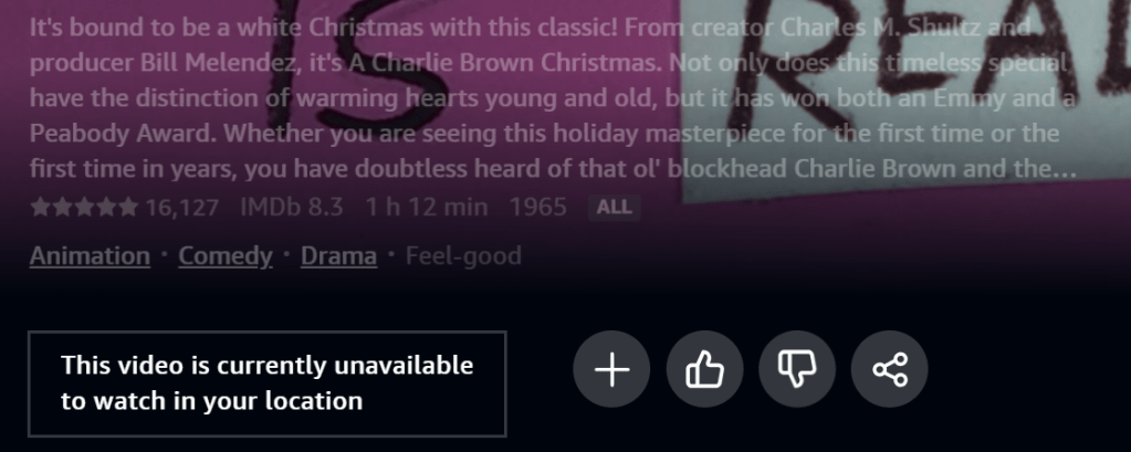 Lastly, she was a little miffed at the absence of A Charlie Brown Christmas. Try as she might to catch it on television, it is either not aired on live tv anymore or her timing is just that awful. The part that irritates her the most is, apparently, she can’t watch it anywhere but Apple TV. Seriously? She was convinced by her family that having an Apple iPhone was the best option so she dropped Android like a bad habit. Whenever she goes into T-Mobile, they always try to talk her into getting an iPad. Her sister has sang the many songs of having a MacBook. (She will not sacrifice function for style. Just look at the way she dresses!). Now Apple has hijacked a small portion of her Christmas childhood tradition. Can she find Charlie Brown on YouTube? They would have you believe, yes, but it’s just a ploy to get her to click on their videos. Can she rent it from Amazon? Let’s check in with Bezos.